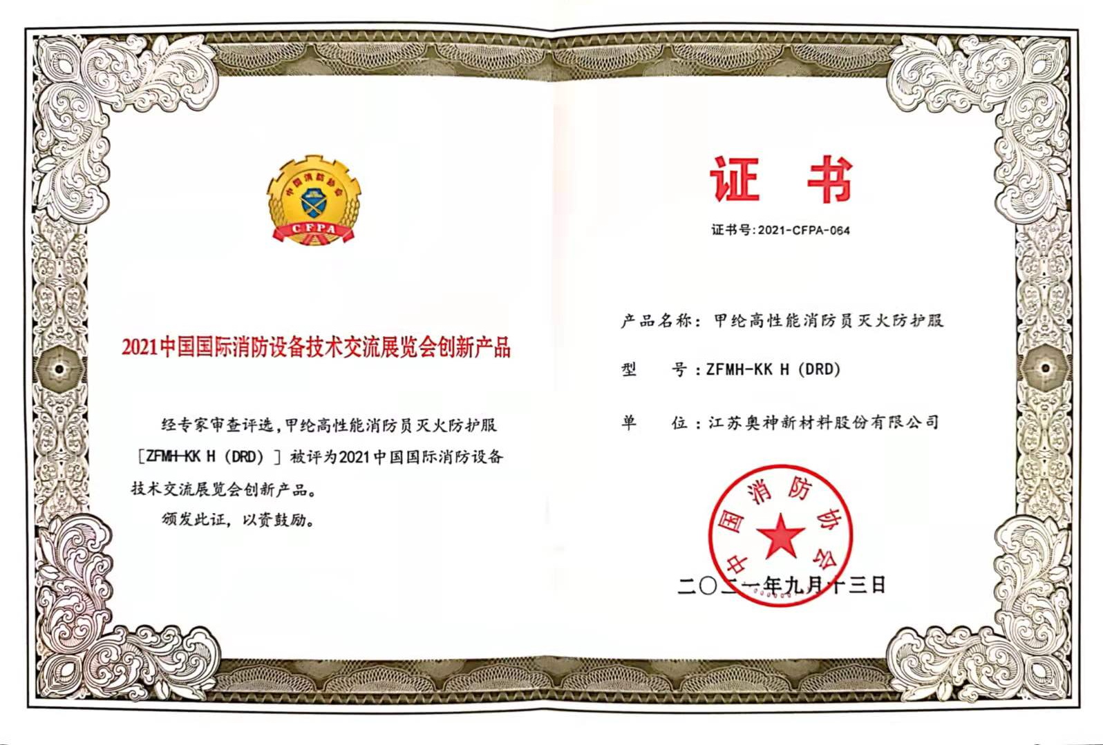 奧神新材料公司榮獲2021中國國際消防設(shè)備技術(shù)交流展覽會創(chuàng)新產(chǎn)品證書