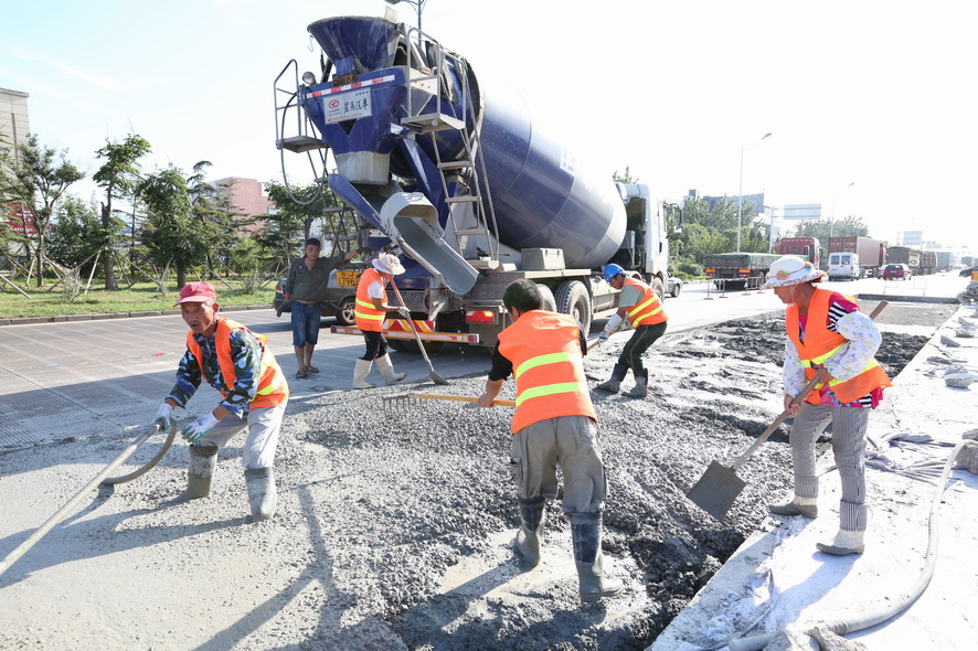 在大港路“新光路至零公里”路段,筆者在水泥路上看到一塊塊被切割成方方正正的凹面,四周都架好防護欄等安全防護設施,在華東城北門偏東不遠處,一臺挖掘機的鏟斗被換上沖擊破碎錘,正在一大塊破損的水泥路面沖擊破碎作業(yè),“嗒嗒嗒”的沖擊聲十分震耳。在與現(xiàn)場作業(yè)的盛達市政公司市政維修項目部副主任史如勤交流中得知,該路段是附近集團箱基站進出港口集裝箱車輛的重要通道,每天有好幾百輛集裝箱車輛進出,水泥路面不堪重負,損壞比較嚴重,根據(jù)開發(fā)區(qū)創(chuàng)衛(wèi)工作要求,由他們對該路段破損處進行局面分割維修,整個路段維修面積達到5000多平方,為保證道路使用通行,采取半幅維修、邊破碎邊澆灌的方式,保證施工進度,現(xiàn)正在維修北側路面,整個路面維修計劃在8月底完成。“因為創(chuàng)衛(wèi),我們下一步還要對轄區(qū)內(nèi)的破損、歪到的路牙石進行維修扶正,242路段瀝青破損路面維護,還要開通四處道口,而現(xiàn)在事多人少,人手比較緊張,我們周六周日都沒有休息,就是想把創(chuàng)衛(wèi)工作任務一項一項地及時完成,決不能拖創(chuàng)衛(wèi)工作后腿?!彼呎f邊用肩上的毛巾擦著額頭上的汗水。