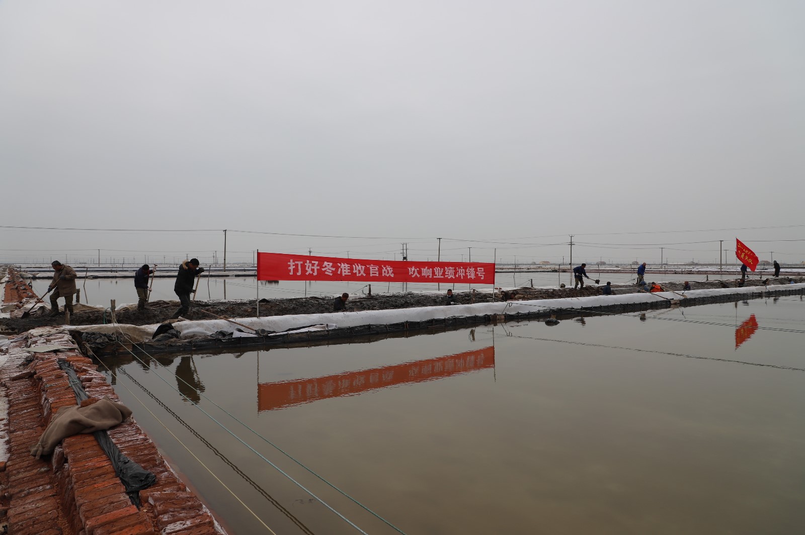 在新河制鹽分公司鹽田地頭的冬準(zhǔn)會(huì)戰(zhàn)現(xiàn)場(chǎng),人頭攢動(dòng),工人們正動(dòng)作嫻熟的進(jìn)行澆水、翻泥、踩實(shí)、做埝、整平……,鹽工們?nèi)?zhēng)先進(jìn)位,手腳不停的揮鍬挖泥,呈現(xiàn)出你追我趕、比肩發(fā)力的勞動(dòng)場(chǎng)景。一條條溝道改造、格堰修整等亮化灘場(chǎng)文明建設(shè)煥然一新,一幅幅“人勤春早”的美麗畫(huà)卷徐徐展開(kāi)。