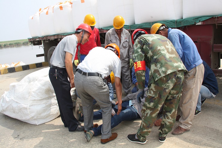 在這次的安全演練中,投資公司運營監(jiān)管部部長李長軍主持了這次的安全演練活動,宵洋物流公司碼頭當班作業(yè)人員參與演練。在五灌河碼頭,正在吊裝的噸袋脫落,砸在一名操作人員的腿上,安全員王緒銀立即指揮停止作業(yè),作業(yè)現場安全負責人陸應兵立即現場指揮人員現場施救,查看傷情,撥打120急救電話,同時向單位負責人沈志兵匯報。沈志兵及時趕到現場啟動應急預案,疏散場地車輛,讓出120進場通道,命令救援小組展開緊急救援,并向公司運營監(jiān)管部和領導報告。在救援中,大家各司其職,齊心協(xié)力,配合默契,有條不紊成功完成了此次演練活動。通過這次應急演練;進一步提高了公司員工在發(fā)生安全傷害事故時的現場處置能力和自救能力。
