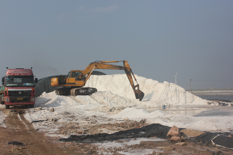 隨后我們又來到了新河制鹽分公司十四班的裝鹽現(xiàn)場(chǎng)。一位工人操作著挖掘機(jī),往卡車上裝鹽銷售,如今裝鹽實(shí)現(xiàn)了機(jī)械化,工人的勞動(dòng)負(fù)荷也減輕了許多。在埒南制鹽分公司的五班,我們看到七八個(gè)工人正在灘頭更換土工布,他們一字排開,先將土工布鋪開,然后分工合作,有的人負(fù)責(zé)把布理齊鋪平,有的則把磚頭鋪放在布上用來固化。