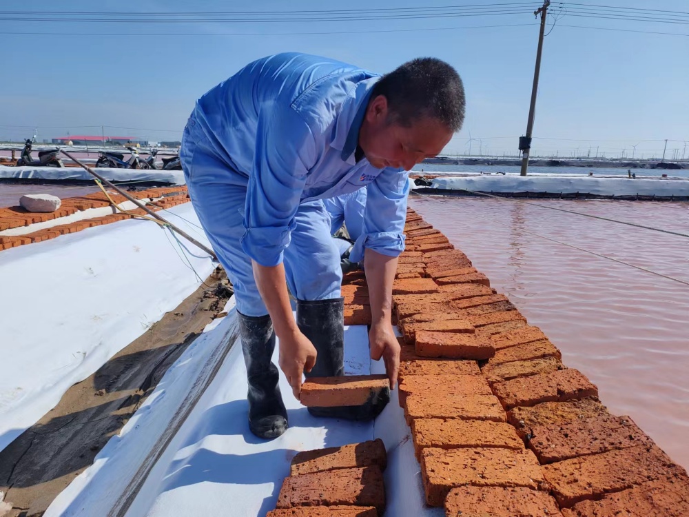 鏖戰(zhàn)酷暑,保目標(biāo)。當(dāng)前,正是原鹽生產(chǎn)的關(guān)鍵時期,面對高溫酷暑的嚴(yán)重考驗,該公司干部職工迎難而上,戰(zhàn)高溫斗酷暑、搶晴天保生產(chǎn),全力投入到高溫生產(chǎn)、保鹽保鹵等工作中,及時修補塑布,加強塑布收放系統(tǒng)維護保養(yǎng),隨時做好拉塑布準(zhǔn)備工作;管理人員以上率下,實施24小時現(xiàn)場值班機制,強化除硫制鹽工藝,抓實抓細(xì)原料鹵水、結(jié)晶池等源頭過程管控,確保全年產(chǎn)鹽60萬噸。驕陽烈日下,萬畝銀灘鹵水潺潺、“五彩斑斕”,產(chǎn)業(yè)工人在39℃高溫的戶外勞作,在熱氣蒸人的鹵水鹽田里,揮汗如雨,構(gòu)成了一幅最美的“鹵上芭蕾”。(許東彥)