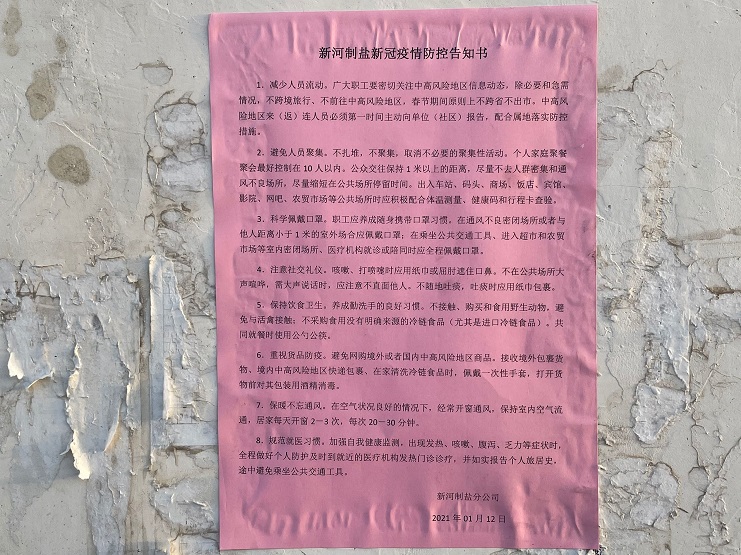 春節(jié)臨近,人員流動(dòng)增加,根據(jù)灌西投資公司疫情防控工作的需要,結(jié)合冬春季疫情形勢,為切實(shí)加強(qiáng)生產(chǎn)一線疫情防控工作 ,進(jìn)一步防范疫情輸入,提高職工自我防護(hù)意識(shí),新河制鹽分公司1月12日在公司醒目位置張貼《疫情防控告知書》,并對(duì)各個(gè)班組發(fā)放《疫情防控告知書》,每位員工簽字并存檔。