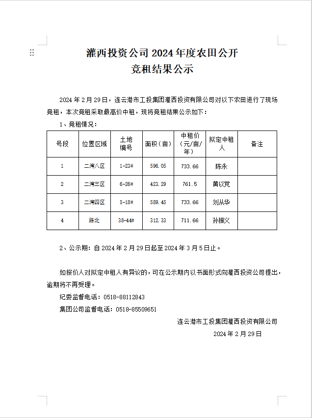灌西投資公司2024年度農(nóng)田公開(kāi)競(jìng)租結(jié)果公示