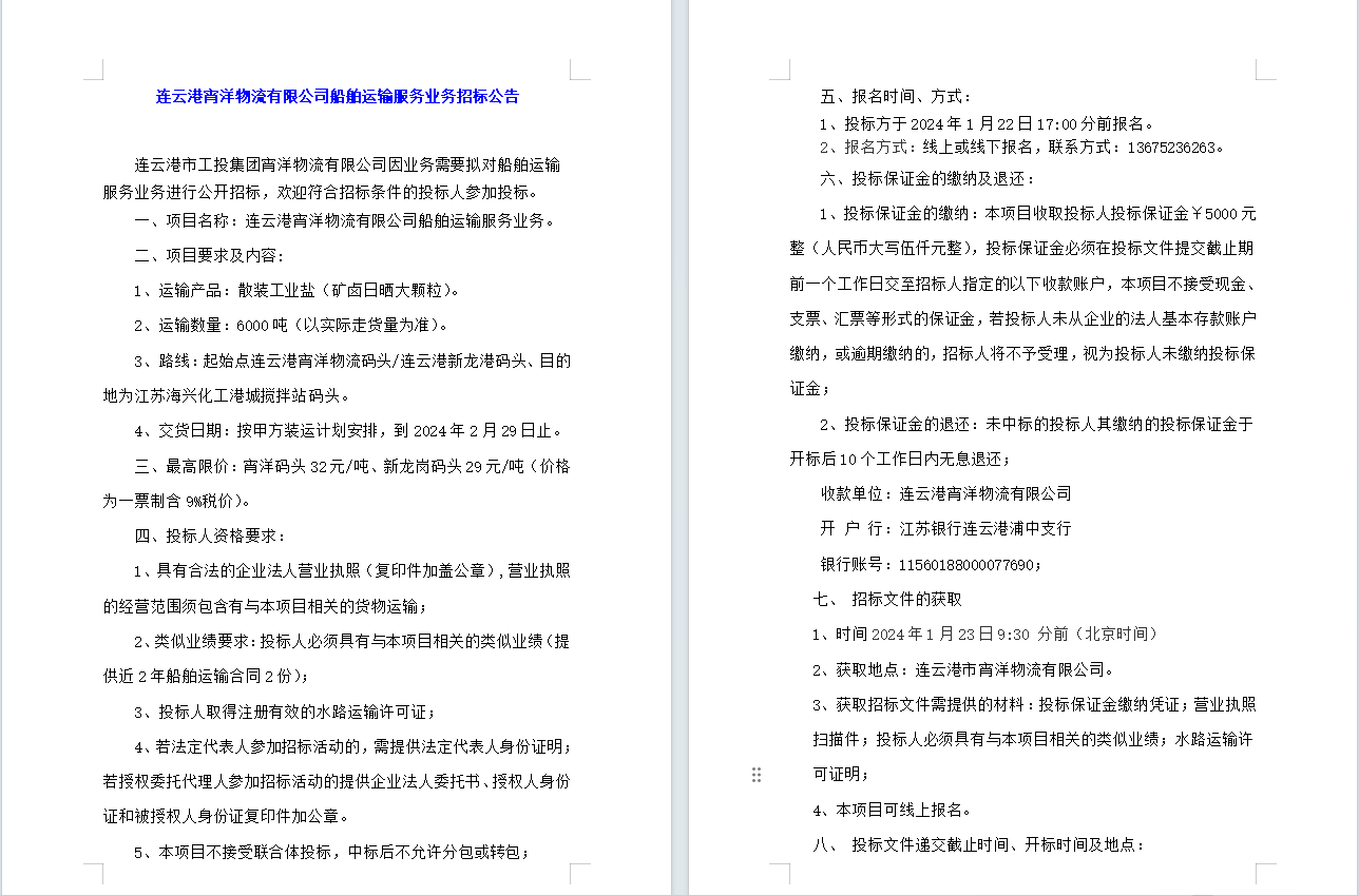 連云港宵洋物流有限公司船舶運(yùn)輸服務(wù)業(yè)務(wù)招標(biāo)公告
