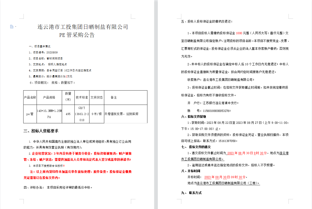 連云港市工投集團(tuán)日曬制鹽有限公司PE管采購公告