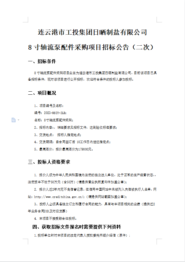 連云港市工投集團(tuán)日曬制鹽有限公司8寸軸流泵配件采購(gòu)項(xiàng)目招標(biāo)公告(二次)