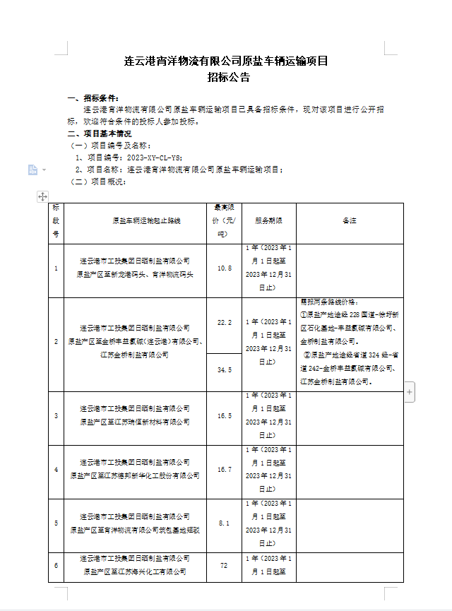 連云港宵洋物流有限公司原鹽車(chē)輛運(yùn)輸項(xiàng)目招標(biāo)公告