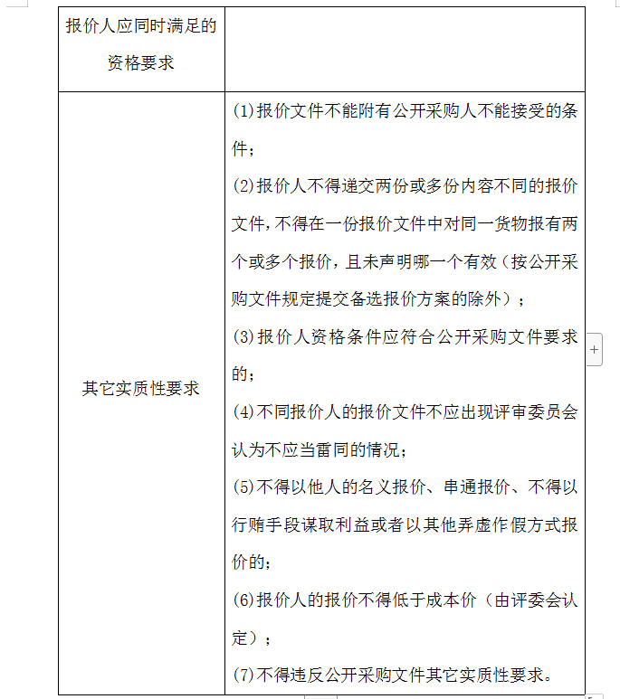 2、評(píng)審委員會(huì)將根據(jù)以下標(biāo)準(zhǔn)對(duì)各報(bào)價(jià)人進(jìn)行初步評(píng)審,有一項(xiàng)不符合要求的,作否決報(bào)價(jià)處理,不進(jìn)入詳細(xì)評(píng)審。