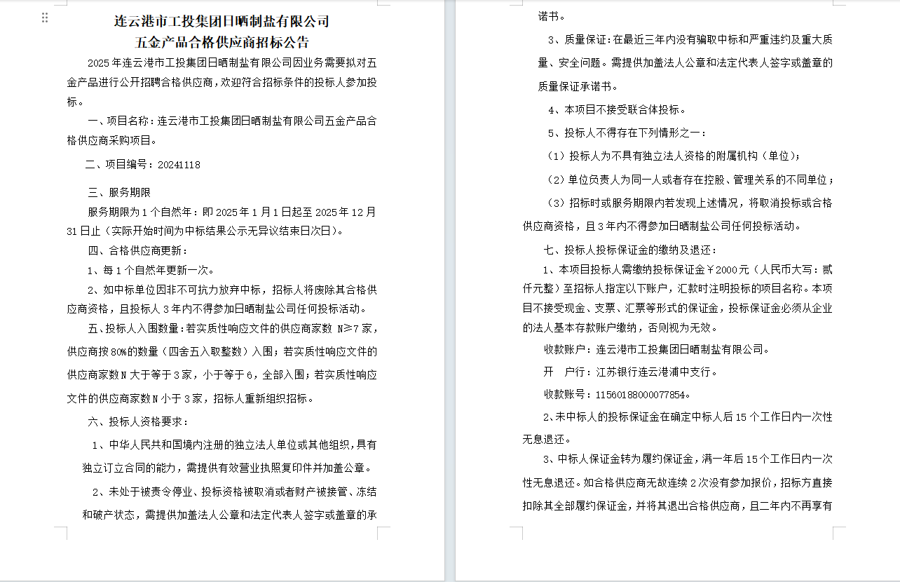 連云港市工投集團日曬制鹽有限公司五金產品合格供應商招標公告