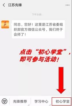 | 各單位黨群工作部: 為引導(dǎo)廣大黨員干部認(rèn)真學(xué)習(xí)《習(xí)近平談治國理政》第三卷,推動黨的科學(xué)理論“飛入尋常百姓家”,“江蘇先鋒”公眾號特開辟“初心學(xué)堂”小程序,請組織本單位黨員干部8月12日—10月30日登錄“初心學(xué)堂”小程序一起聽音頻、讀原著、悟原理!(請各位黨員登陸后,單位名稱統(tǒng)一填寫為:連云港市工業(yè)投資集團(tuán)有限公司) 第一步:關(guān)注“江蘇先鋒”公眾號