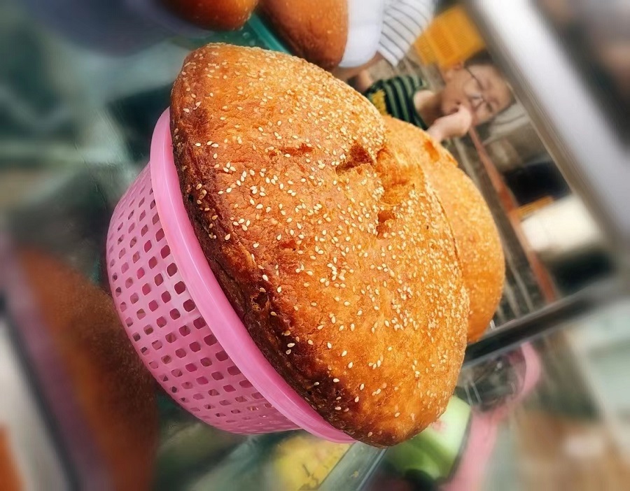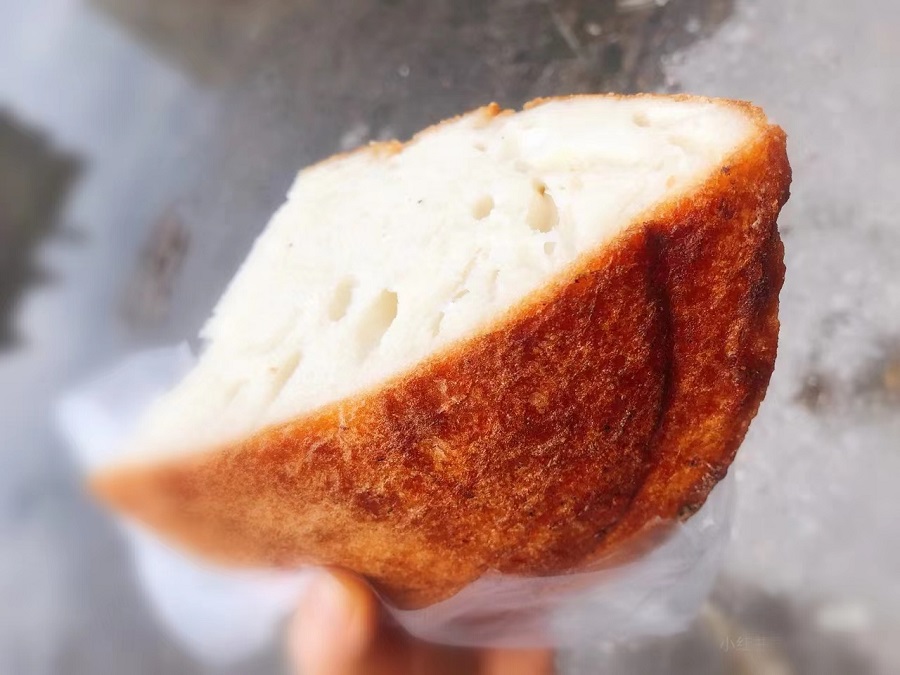 它的做法看似簡單,其實非常考量主婦的功底。面粉加入老酵,放在暖和的地方讓其自然發(fā)酵至漲滿容器。自家的土灶保持最小的火星,鍋內(nèi)刷上薄薄一層油,倒入面糊。面團在鍋中慢慢膨脹,待一年微微發(fā)硬,變焦黃色,撒上一層薄薄的芝麻,刷上一層油,翻面繼續(xù)小火慢焗??此坪唵危鋵崨]有幾年做飯功底,還真不一定能成功。一個成功的漲燒餅,外脆里軟,內(nèi)里一個個孔洞,松軟有彈性。我比較喜歡吃外皮,香脆,可口,老年人多愛吃內(nèi)里,有種老酵的清香,微甜。它真的是一款老少皆宜的美味了。