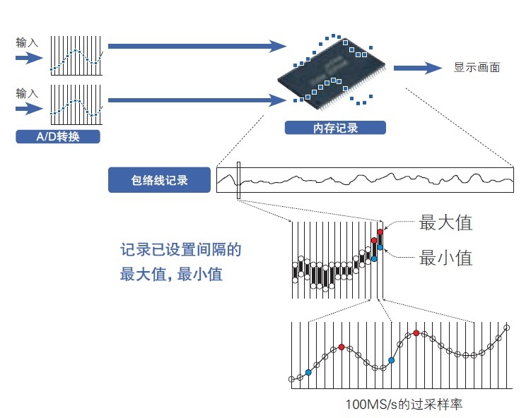 通過(guò)包絡(luò)線的測(cè)量方法,進(jìn)行100MS/s的過(guò)采樣同時(shí),能夠記錄設(shè)置間隔的max值和min值。
