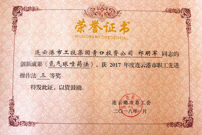 祁明軍的《氫氣球噴藥法》獲得2017年度連云港市職工先進(jìn)操作法三等獎(jiǎng)。由他發(fā)明的氫氣球噴藥法,噴藥機(jī)結(jié)構(gòu)簡(jiǎn)單,成本低廉,且可靈活調(diào)整,省工省時(shí),霧化效果好。目前該操作法已在青口公司全面推廣使用?!。ㄇ喙ぃ?/span>