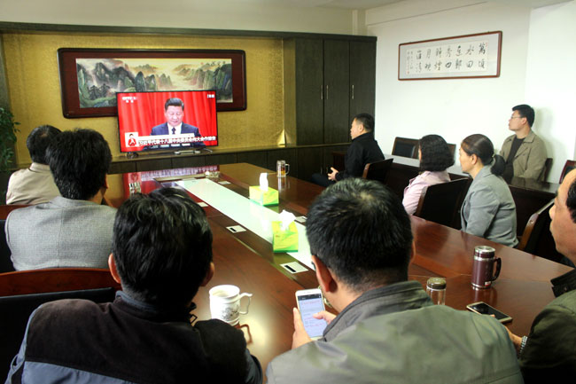 大家早早就集中到各收看點,做好收看準備。報告伊始,大家聚精會神,仔細聆聽報告內(nèi)容,并不時做著記錄。大家一致認為黨的十九大是在全面建成小康社會決勝階段、中國特色社會主義進入新時代的關(guān)鍵時期召開的一次十分重要的大會,會議的召開是全黨、全國各族人民政治生活中的一件大事。習(xí)近平總書記所作的報告全面總結(jié)了黨的十八大以來治國理政的輝煌成就和寶貴經(jīng)驗,展望了新時代中國共產(chǎn)黨的歷史使命、新時代中國特色社會主義思想和基本方略。習(xí)近平總書記的報告高瞻遠矚,氣勢恢宏,總攬全局,振奮人心。