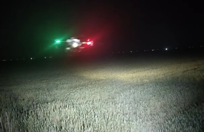 加班加點(diǎn)抓防治。晚上9點(diǎn),大新農(nóng)場組織2臺無人植保機(jī)在耐鹽堿小麥地實施小麥化噴施葉面肥作業(yè)。