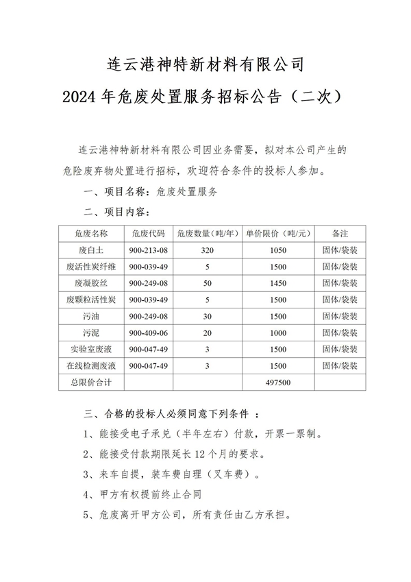 神特公司2024年危廢處置服務招標公告(二次)