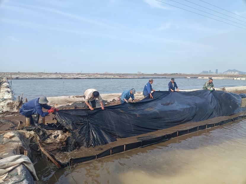 為了盡快完成海濱鈣液儲(chǔ)備池改造,5月3日,礦鹽班組、鈣液班組人員全員集聚到海濱鈣液灘,把舊塑布進(jìn)行回收安置,同時(shí)對(duì)鈣液輸送管道進(jìn)行細(xì)致的檢查,發(fā)現(xiàn)需要維修的接口及時(shí)維修,確保鈣液儲(chǔ)備池能夠順利完成改造。此次海濱鈣液池的改造可以存儲(chǔ)1.5萬(wàn)方,同時(shí)也可以盡快退出鈣液生產(chǎn)用地,進(jìn)行改造養(yǎng)殖池塘,為公司增加收入。