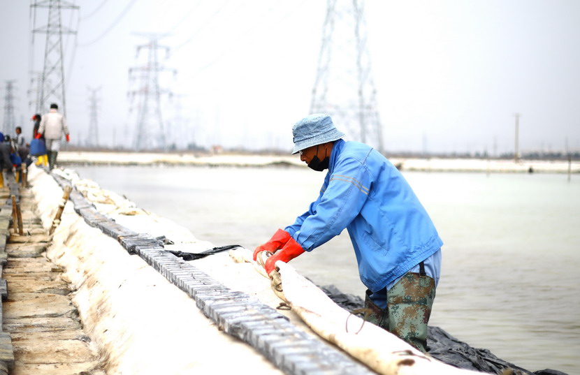 ? ? ? ??首先來到海州灣公司大浦班組。這里是公司礦鹵復(fù)產(chǎn)工作重點班組,職工們正在整理結(jié)晶池、搶修塑苫布。據(jù)海州灣公司負責人劉天義現(xiàn)場介紹,由于前期審批、采購等原因,加之突發(fā)的新冠肺炎疫情,結(jié)晶池塑苫布沒能及時更新,預(yù)報25日有明顯降雨過程,海州灣廣大職工因地制宜,收舊利廢,積極備戰(zhàn)大雨天時。