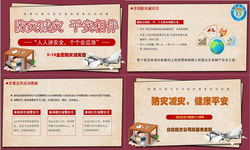 近日,離退休支部開展“5·12防災減災”科普活動。結(jié)合支部的實際情況,通過辦公場所用電防火安全檢查和交通出行安全警示,進一步排查整改生活、工作中存在的安全隱患。組織觀看防災減災宣傳片和制作防災減災PPT來普及防災減災知識,了解地震、臺風、暴雨、洪水等自然災害的應對措施,來防范化解災害風險,提升公眾防災減災的意識和能力,實現(xiàn)“人人講安全,個個會應急”。