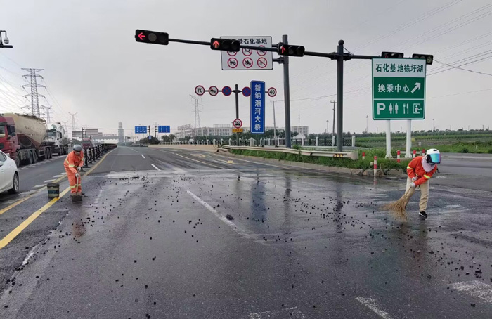 7月27日上午,臨近下班之時(shí),該分公司228省道班長姚功,接到公司應(yīng)急處理電話,疏港大道向西路面近1500多米長,車輛拋灑嚴(yán)重影響往來車輛安全經(jīng)過。正在下班的途中他二話沒說,調(diào)轉(zhuǎn)車頭奔赴事發(fā)地點(diǎn)疏港大道,迅速擺開安全錐,揮動(dòng)手中鐵銑開始突擊清理路面上礦土,石塊。聞?dòng)嵉弥耸拢伯a(chǎn)黨員紀(jì)樹好,胡可貴,班組成員孫洪召等同志二話沒說,一并趕往現(xiàn)場支援,橙色工作服在陽光照耀下顯得格外靚麗。工作現(xiàn)場,遇到大的石塊他們就用手搬,小的、碎的就用鐵锨和掃把清理,中午的陽光火辣辣的,他們就這樣頂著烈日奮戰(zhàn)近兩個(gè)多小時(shí),共轉(zhuǎn)運(yùn)礦土泥塊、石子近10余車,高質(zhì)高效保障了核心道路車輛安全通行。(楊波)
